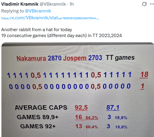 | Почитатель: Мне было бы интересно, если бы кто-нибудь прокомментировал вчерашние твиты Крамника - не о "поведении Накамуры", а с конкретными цифрами Накамуры. |