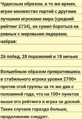 6) Такс, если он не проигрывает, то показывает перфоманс 2700+. Попался!! Теперь главное - не вычислить случайно среднее между 2450 и 2700, а то все пойдет наперекосяк.
