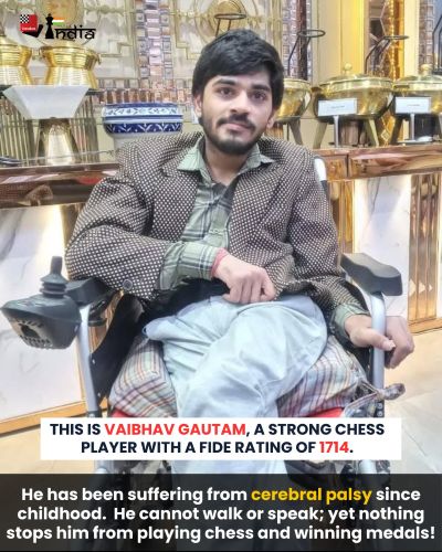 Вайбхав Гаутам — один из перспективных шахматистов Индии. С детства он живёт с церебральным параличом: не может ходить, говорить и имеет ограниченный контроль над движениями тела. Но всё это не имеет значения на шахматной доске.