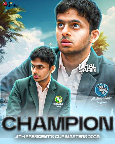 Huge congratulations to Nihal Sarin on becoming the Champion of the 4th President's Cup Masters with a round to spare! Nihal scored a strong win over Shamsiddin Vokhidov in the 8th round, reaching 6/8 points and taking an 1.5 point lead over the field - winning the event.