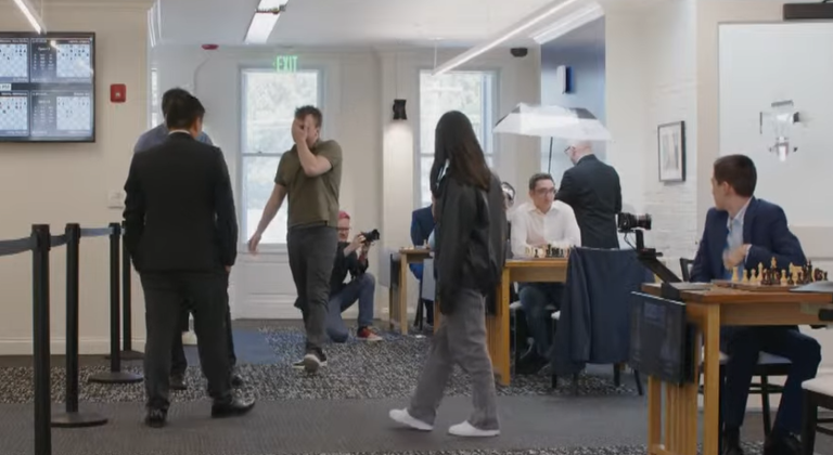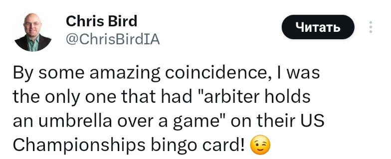 — Конечно. Уэсли даже остановил часы — ведь если партия прерывается, оба игрока получают время подумать. Так что пауза длилась недолго. Это выглядело забавно — такого ведь никто не видел. Прямо как в фильме про британскую королевскую семью, где у короля стоит дворецкий с зонтом. Немного странно, но фото получилось очень забавным. Если показать это человеку, не связанному с шахматами, он, наверное, вообще не поймёт, что происходит и зачем этот зонт.