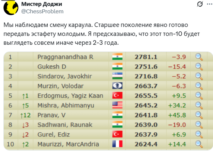 xajik: Когда Со "сидел" на рейтинге и не играл, и его обошел Алиреза. То последнего обвиняют в неэтичности. Когда ДИнгу запрещали играть из-за ковида, но потом те же(или почти те же) запрещавшие под него собрали турнир. То оже неэьично. Когда Накамура "сидит"на рейтинге , но играет- это опять неэтично. В сторону главенсвующие правила, и какой-то разговор о "этичности", который даже не последователен ??