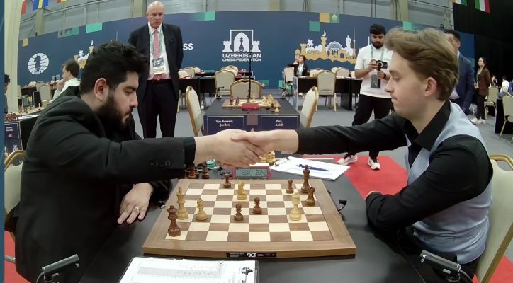 Чемпион мира Гукеш сыграл вничью с армянским гроссмейстером Робертом Ованнисяном чёрными фигурами в девятом туре «Большой швейцарки» ФИДЕ. Посмотрите, как узбекские дети выражают огромную любовь к Гукешу после партии!