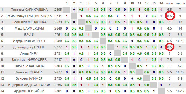 Только Ван Хао имел 6 (но занял первое, победив в обеих оставшихся партиях белыми и чёрными чёрными и белыми)