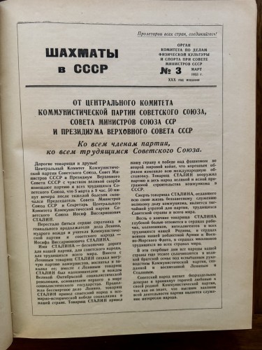 «Шахматы в СССР» (№ 3, 1953) открывается портретом Сталина, за которым следует двухстраничное обращение ЦК Коммунистической партии, Совета министров СССР и Президиума Верховного Совета СССР.