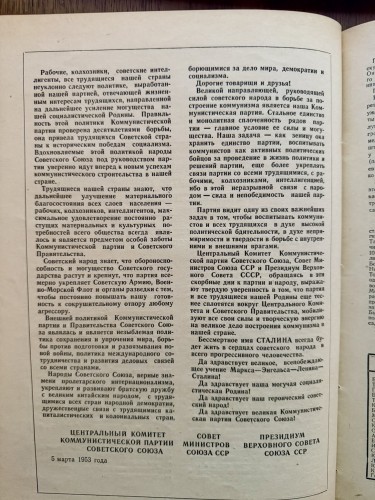 "Бессмертное имя СТАЛИНА всегда будет жить в сердцах советского народа и всего прогрессивного человечества"