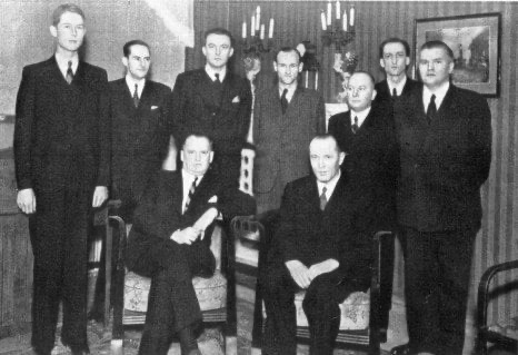 Стоят: K. Junge, J. Podgorný, J. Foltys, F. Sämisch, J. Rejfíř, C. Kende (organizer), F. Prokop.