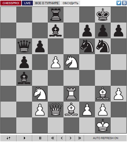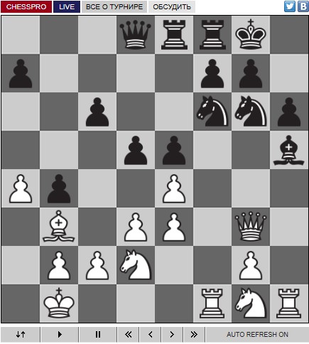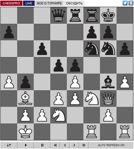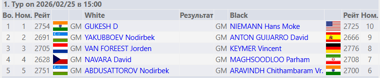 Контроль времени: 90 минут на 40 ходов, затем 30 минут до конца партии с добавлением 30 секунд на ход начиная с первого.