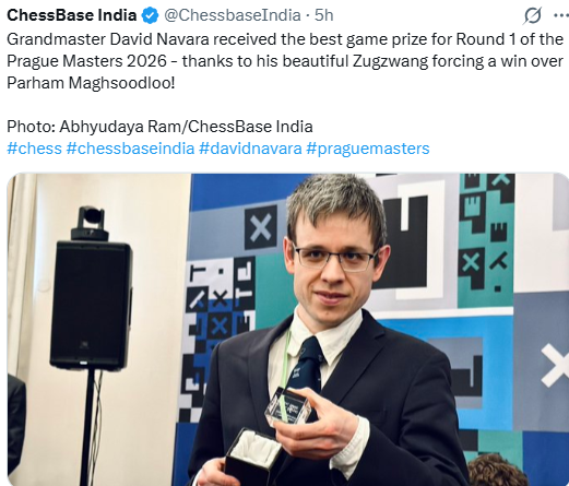 «Ладьи были расставлены настолько неудачно, что он попадал в цугцванг. Это было так, словно чёрные играли без фигуры!» — Давид Навара после победы над Пархамом Магсудлу в первом туре Prague Chess Masters 2026.