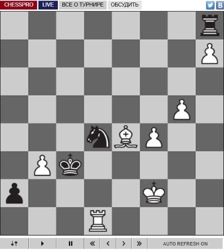 Когда его король оказался на e4, я сыграл король f2. Мне казалось, что вместо конь d6 был возможен ход a4. — Какой ход? — Нет, король d3 он сыграл. — А, да. Тогда я пошёл g4.
