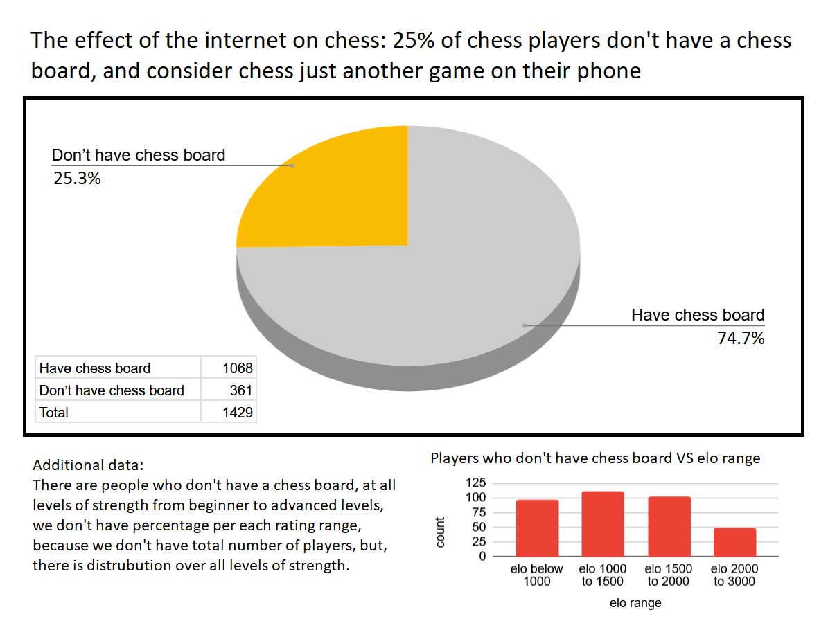 | 25% шахматистов не имеют шахматной доски и воспринимают шахматы просто как ещё одну игру на телефоне. |