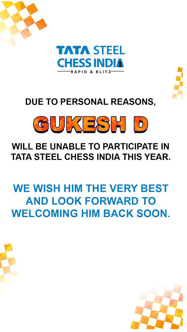 | Гукеш выбыл из турнира Tata Steel Rapid & blitz Event в Калькутте, который должен был пройти с 7 по 11 января. Его место в составе из 10 участников займет Нихал Сарин. |