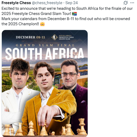 Всё решится в Южной Африке, где наконец-то будет коронован чемпион мира по фристайл-шахматам 2025 года!! 🤩♟️