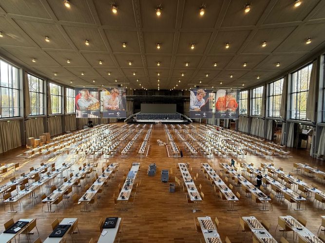 Рабочие места Себастьяна Зибрехта (комментатор VIP-зала), Клауса Бишоффа (комментатор) и медиа-команды уже подготовлены. Фотограф сверху видит всё происходящее. Главный вопрос: кто встретится с Магнусом Карлсеном в первом раунде?