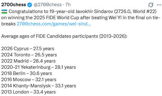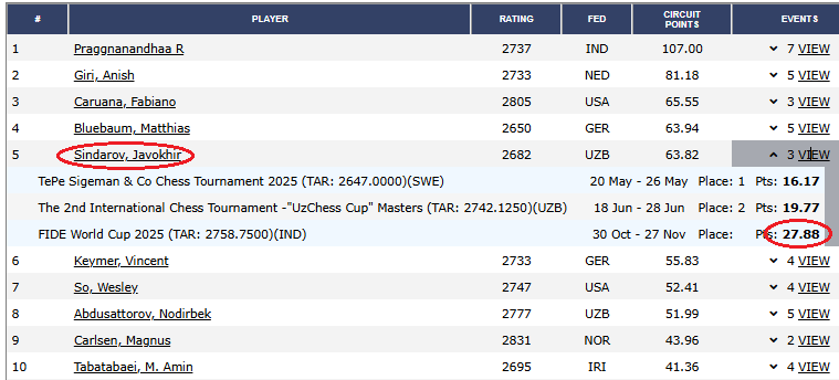 Очки восьмерки лучших по результатам Кубка в зачёт ФИДЕ-циркуита "никого не волнуют", однако замечу, что Якуббоеву они почему-то не добавлены (а он должен подняться на 9 строчку - сразу за Абдусатторовым).