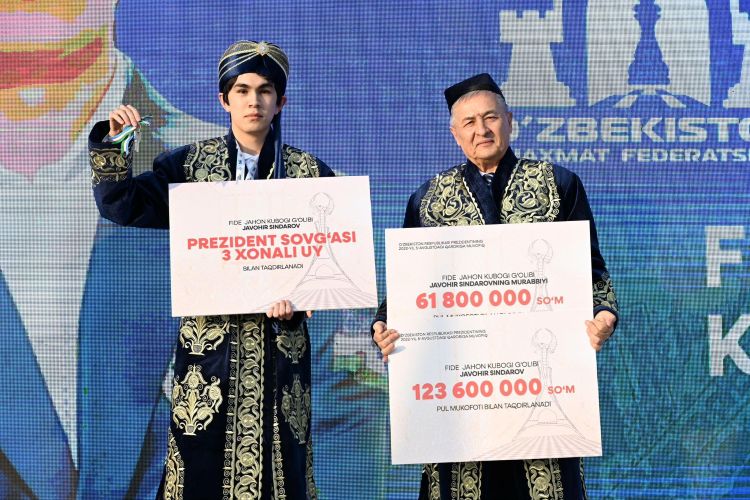 Кроме того, наш шахматист, ставший обладателем Кубка мира, будет награжден подарком Президента – трехкомнатной квартирой, а его тренеры - денежными вознаграждениями. |
