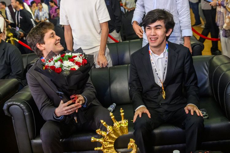 | Несколько фотографий победителя Кубка мира ФИДЕ 2025 в Гоа, Жавохира Синдарова! Синдарова сопровождали его секундант Мухиддин Мадаминов, его брат Исламбек Синдаров и его бабушка с дедушкой. Какой прекрасный момент для узбекских шахмат! |