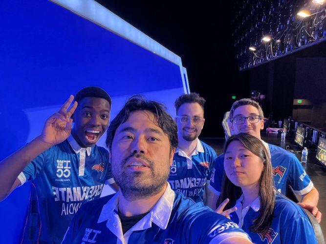 Сборная США делает командное селфи после уверенной победы над сборной Индии в матче Checkmate: USA vs India, прошедшем на киберспортивной арене Arlington Esports Stadium в Техасе.