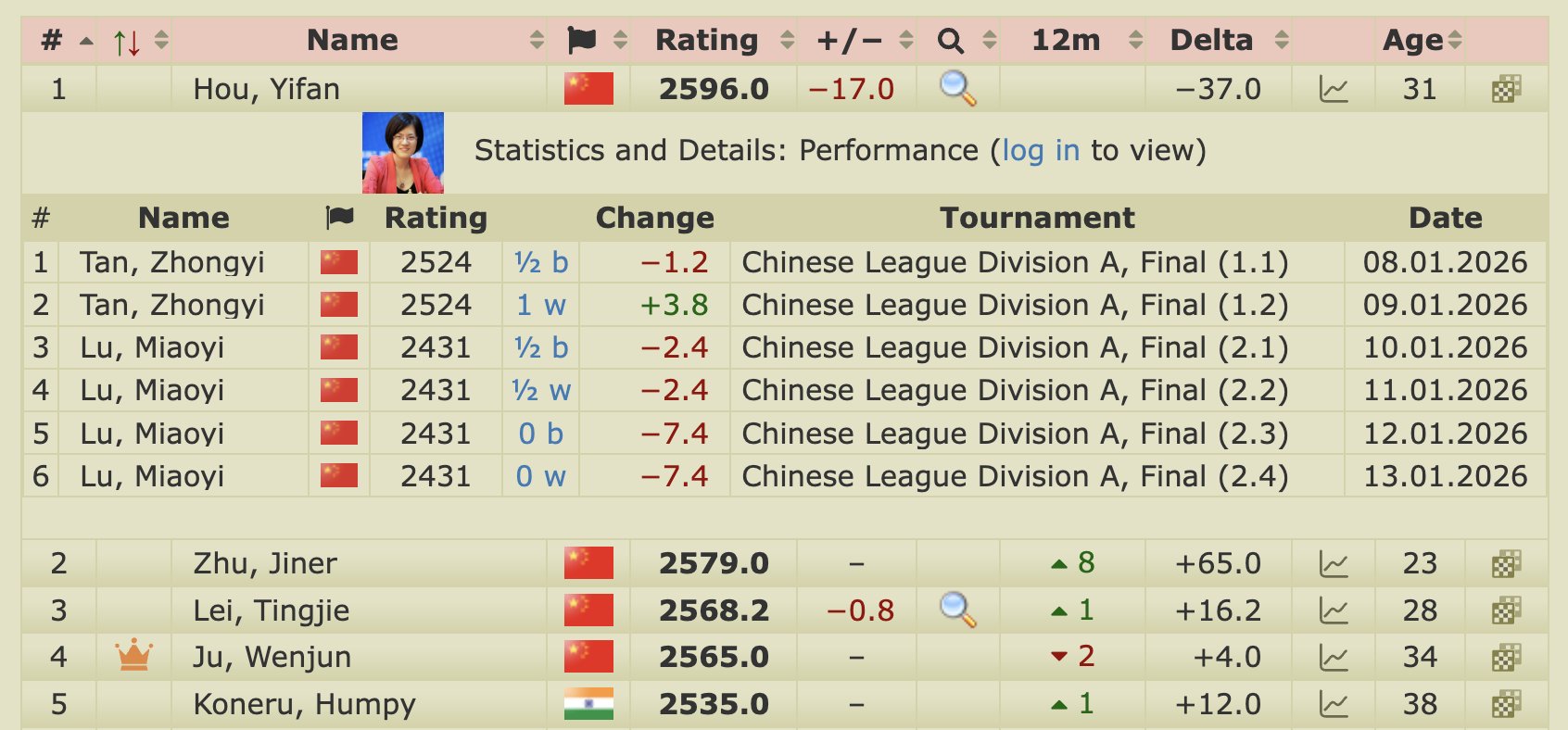 | 15-летняя Лу Мяои одержала вторую подряд победу над Хоу Ифань, что принесло её команде победу в Китайской лиге и означает, что первая шахматистка мира среди женщин впервые с 2013 года опустилась ниже рейтинга 2600. |