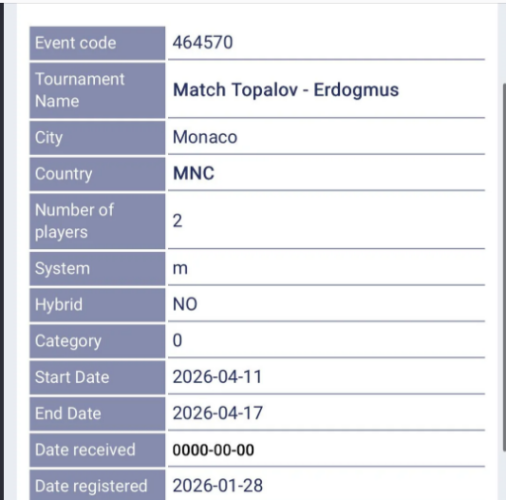 Турецкий гроссмейстер Ягиз Каан Эрдогмуш и болгарский гроссмейстер Веселин Топалов проведут классический показательный матч. Игра состоится в Монако с 11 по 17 апреля.