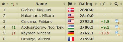 | Каруана вплотную приблизился к 2800 в лайв-рейтинге. |