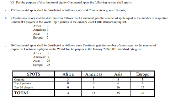 c. 60 Continental spots shall be distributed as follows: each Continent gets the number of spots equal to the number of respective Continent’s players in the World Top 60 players in the January 2024 FIDE standard rating list.