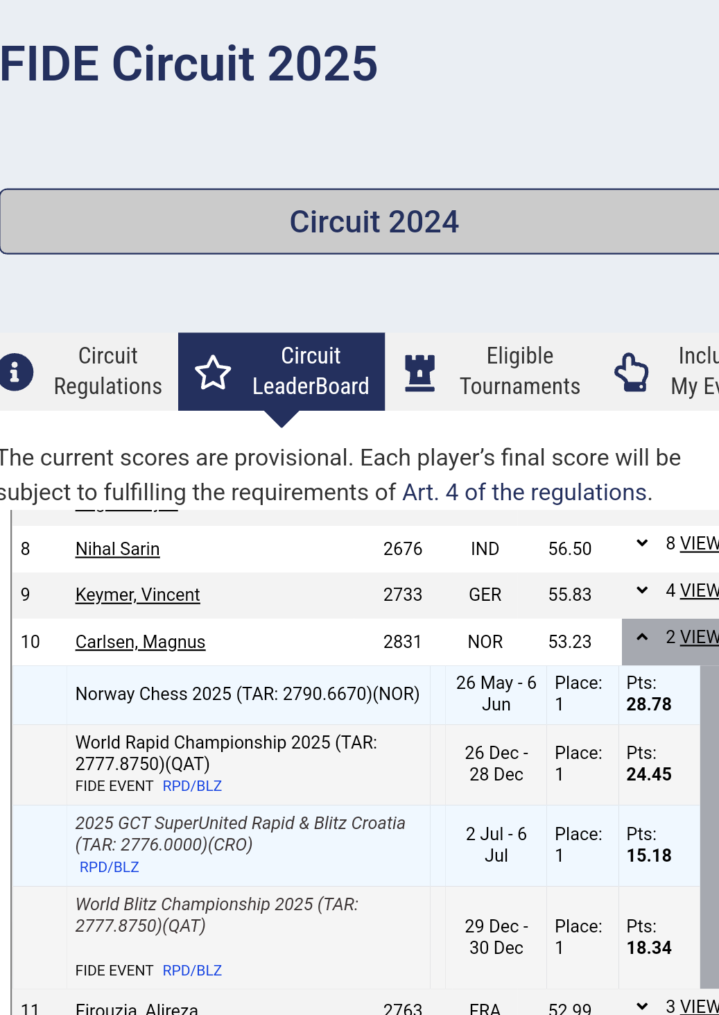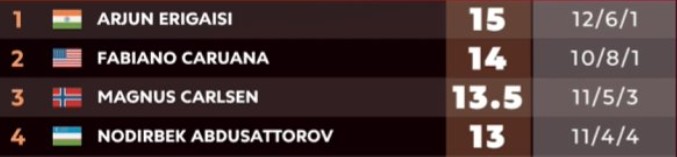 А вот и фиде цирк результаты. Как и говорилось, ну потому что это согласно правил подсчёта, Магнусу чемпионство мира по блицу в зачёт не идёт! Оно ему может и не надо. Однако сам факт показывает, насколько несбалансирован подсчет в фиде цирке.
