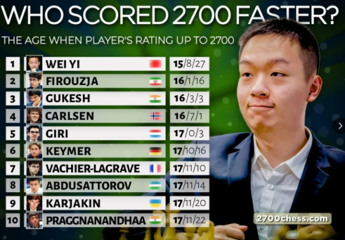 | Ягыз Каан Эрдогмуш (14 лет, 7 месяцев и 22 дня) имеет лайв-рейтинг 2682,9 и у него есть больше года, чтобы побить рекорд Вэй И и преодолеть отметку 2700. |