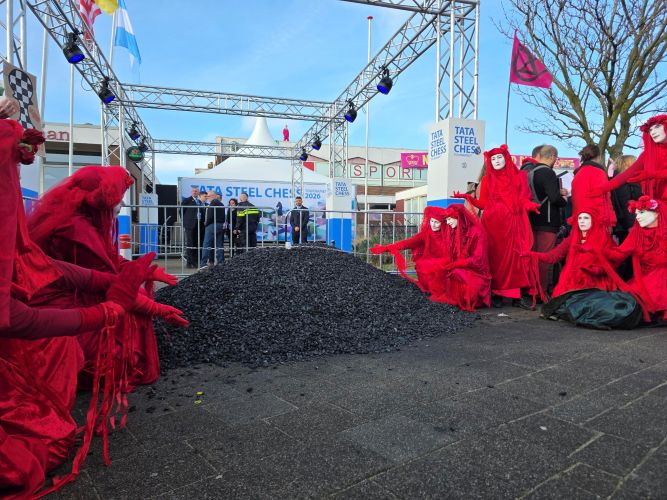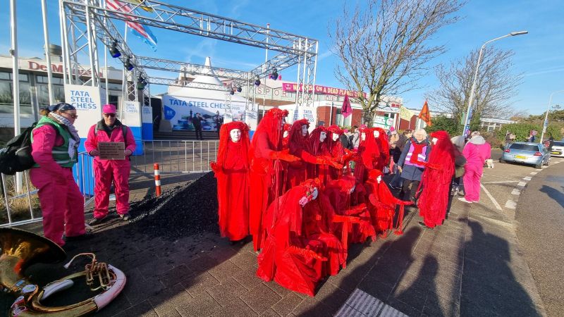 Протестующие, представляющие организацию Extinction Rebellion (XR) в Нидерландах, проводят акцию против спонсорства Tata Steel шахматного турнира, рассматривая это как "спортвошинг" (отмывание репутации через спорт). Их точные требования включают: