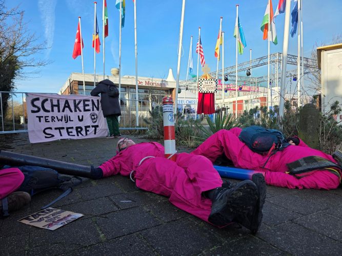 Сегодня мы блокируем вход на шахматный турнир Tata Steel в Вейк-ан-Зее. Повстанцы сбрасывают 2025 килограммов угля, используют системы автоматического уничтожения и вывешивают баннер: «Нет шахматам на мертвой планете». 2025 год — это год, к которому Tata Steel должна была достичь климатической нейтральности.