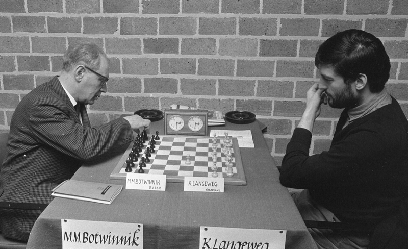 | Hoogoven Schaaktoernooi. M.M. Botwinnik (links) en Kick Langeweg |