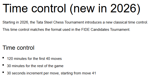 | Организаторы даже изменили контроль времени, чтобы максимально приблизить его к тому, что будет в ТП. Оно бы и разумно, да только претенденты будут играть с контролем «120 минут на 40 ходов плюс 30 минут до конца с полуминутной добавкой с 41-го хода», а в Вейке контроль «100 минут на 40 ходов плюс 50 минут до конца с полуминутной добавкой с 41-го хода» |