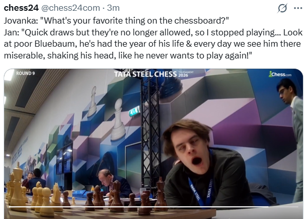 «Сегодня Ван Форест из Гронингена имеет очень хорошую позицию против Винсента Каймера, молодого немецкого шахматиста. А Йорден, да, как всегда агрессивен, но сегодня он выбрал Лондонскую систему. И красивое H4, H5, H6».