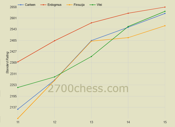 Карлсен вошел в Топ-100 в 15 лет, Вэй И - в 15 с половиной, Фирузджа - в 15 лет 8 месяцев.