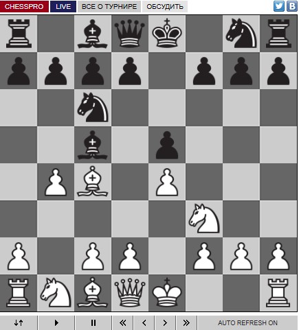 — И, очевидно, это сработало. Давайте теперь взглянем на эту партию в Русской защите. Началась она спокойно, но потом доска буквально загорелась.