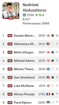 Нодирбеку осталось сыграть чёрными против Фирузджи и белыми против Эльянова.