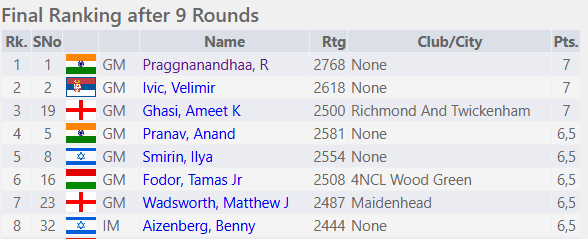 | Гроссмейстер Рамешбабу Праггнанандаа (Индия), набравший 7 из 9, вышел победителем на 2025 XTX Markets London Chess Classic Open. Столько же очков в активе В.Ивича (Сербия) и А.Гаси (Англия) | (е3е5)