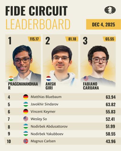 | Результат Праггнанандхи в турнире FIDE Circuit теперь составляет 115,17, включая 8,17 очков за совместное первое место на London Open! Если Абдусатторов займёт чистое первое место в Лондоне, на чемпионате мира по быстрым шахматам и блицу, его результат будет примерно 113, так что место Прагга в претендентском турнире практически гарантировано! |