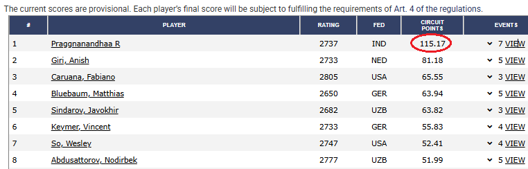 | Praggnanandhaa's FIDE Circuit score is now 115.17 with the inclusion of 8.17 points for joint 1st in the London Open! If Abdusattorov takes clear 1st in London, the World Rapid & the World Blitz he would currently end with ~113 — so Pragg's Candidates spot is almost locked in! |
