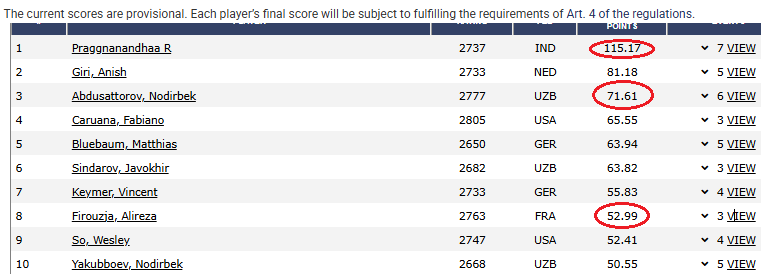 It's not quite over, as Abdusattorov will now play in the 10-round Super Rapidplay on Saturday and Sunday. That event, with a £10,000 (~$13,300) top prize, will include the Elite players and other stars such as GM Leinier Dominguez. There are potentially around 10 FIDE Circuit points up for grabs, but it's unlikely to help Abdusattorov in his quest to overhaul GM Praggnanandhaa Rameshbabu. Only two rapid and blitz events can be counted and Abdusattorov would likely need to win both the World Rapid and Blitz titles—so that the Super Rapidplay would be discarded.