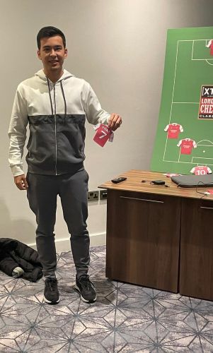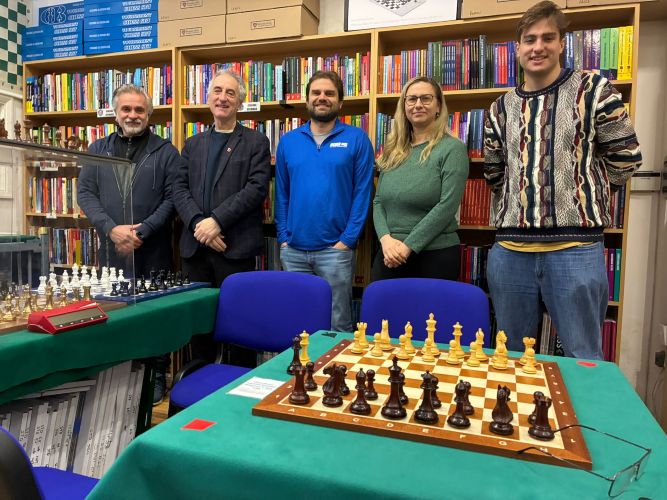 | "Было здорово приветствовать великолепного @SamShankland в нашем шахматном магазине. Мы желаем ему удачи на @london_chess. Он был настолько любезен, что подписал экземпляры своих книг" |