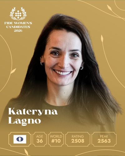 Kateryna Lagno приходит на турнир с почти двадцатилетним опытом выступлений на высшем уровне в нескольких циклах чемпионата мира. Она заявила о себе очень рано, выиграв чемпионат Европы среди женщин в 2005 году всего в 15 лет, и с тех пор собрала впечатляющую коллекцию титулов во всех контролях времени.