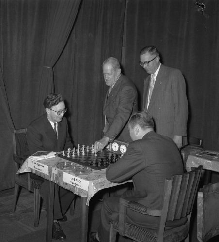 Ровно 70 лет назад, в 1956 году, это произошло в Амстердаме. Александр Рюб, бывший и первый президент ФИДЕ, делает первый ход в партии Смыслов — Сабо, а главный арбитр Эйве наблюдает за этим. Далее — вид изнутри игрового зала, павильона «Минерва».