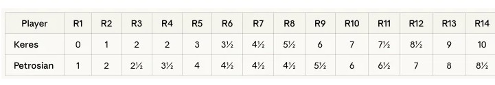 В этой таблице показаны суммарные баллы Кереса и Петросяна на этапе в Бледе в рамках турнира кандидатов в Югославию 1959 года. Возможно, 3,5 из 4 не гарантирует победу в турнире?