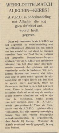 Таким образом, пока что Алихин в никакой форме не принял приглашение сыграть с Кересом за титул. По финансовым вопросам согласия ещё нет. Керес готов играть с Алихиным, но нужно завершить все организационные моменты, чтобы титульный матч, который будет организован AVRO, состоялся.