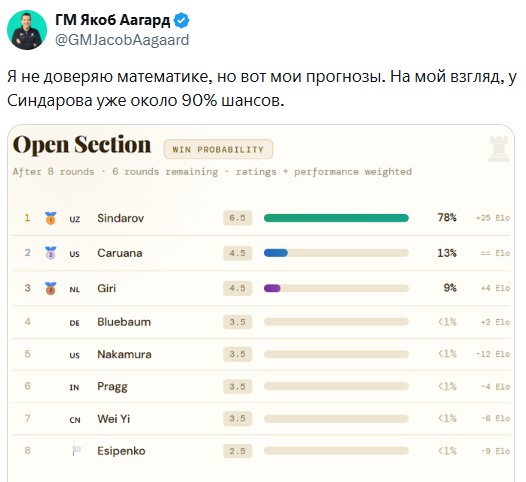 — Последний вопрос. Турнирная таблица женщин постоянно меняется. Эта победа для вас очень хороша, особенно если Анна, возможно, сыграла вничью. Как вы оцениваете свои шансы на победу в женском турнире кандидатов?