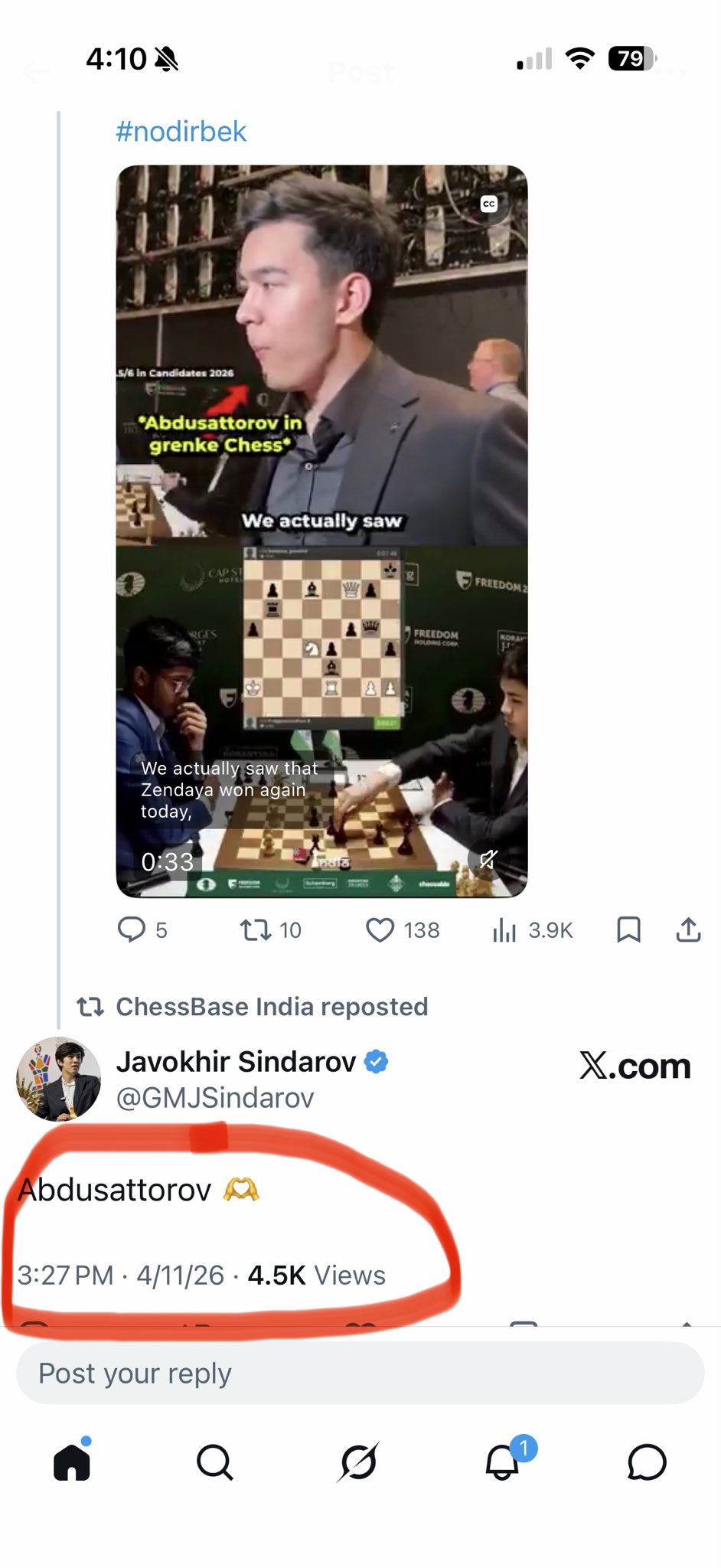 lasker emanuel: Всего за 3 минуты до начала сегодняшней игры, @GMJSindarov нашел время поблагодарить своего друга.