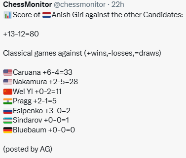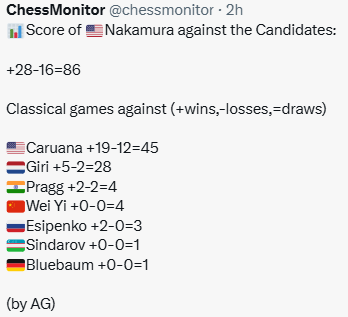 Почитатель: Относительно статистики Каруаны против Накамуры ("удивительно плохой") добавлю ещё удивительного. Последний раз, когда Каруана выиграл у Накамуры партию в классику - первый тур турнира претендентов в Мадриде, 2022 год.