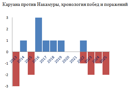 Каруана против Накамуры: неожиданна "серийность" ("однонаправленность" результативных партий в течение лет).