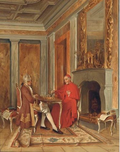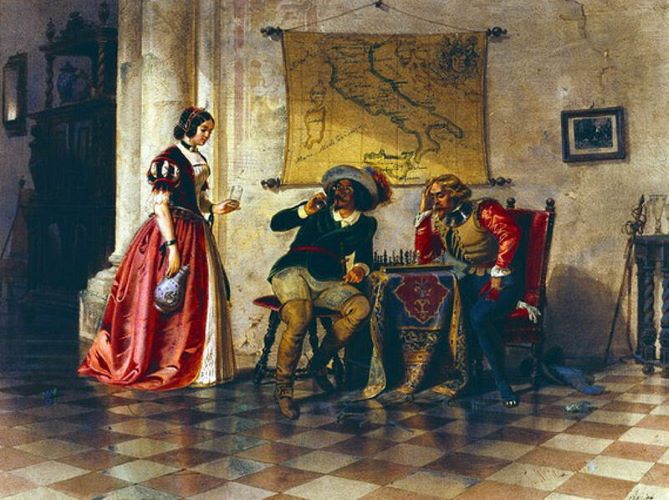 Этот исторический сюжет более, на мой взгляд, интересно обыгран другим немецким живописцем (стр.5 пост 149). А история для немцев памятная и не без романтического флёра, иначе не заслужила бы такого внимания мастеров кисти - у Вернера есть вариант картины уже без шахмат, что, однако, грешит против исторической правды
